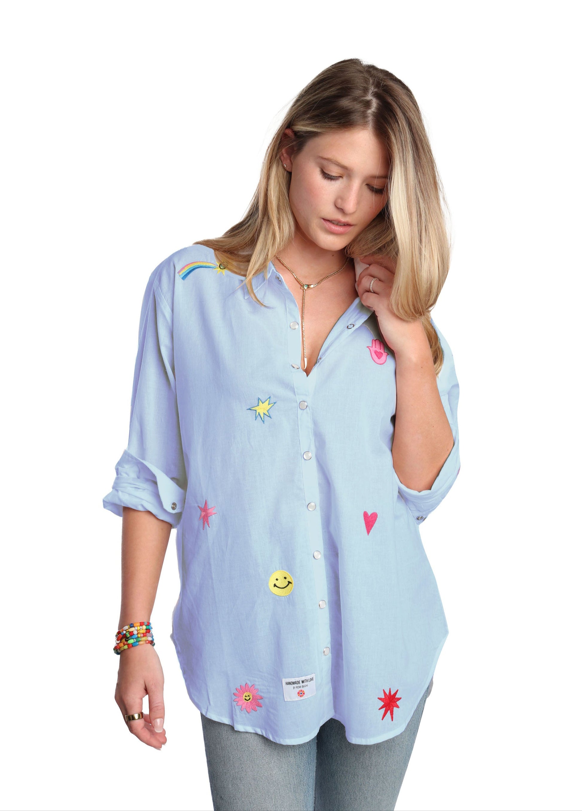 100% Lightweight Cotton button-down shirt with good vibes embroidery.