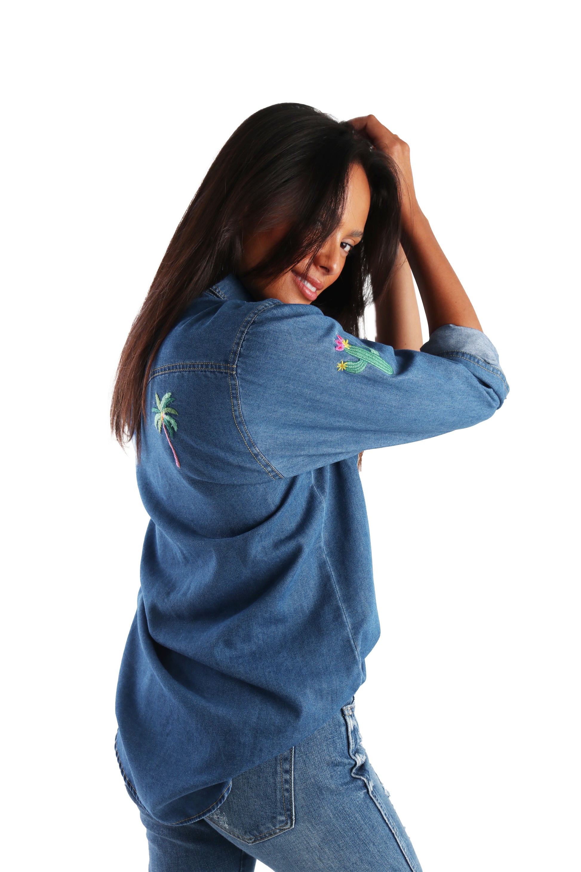 One Size Denim Shirt with colorful embroidered designs and western snap buttons - the perfect twist on a classic.