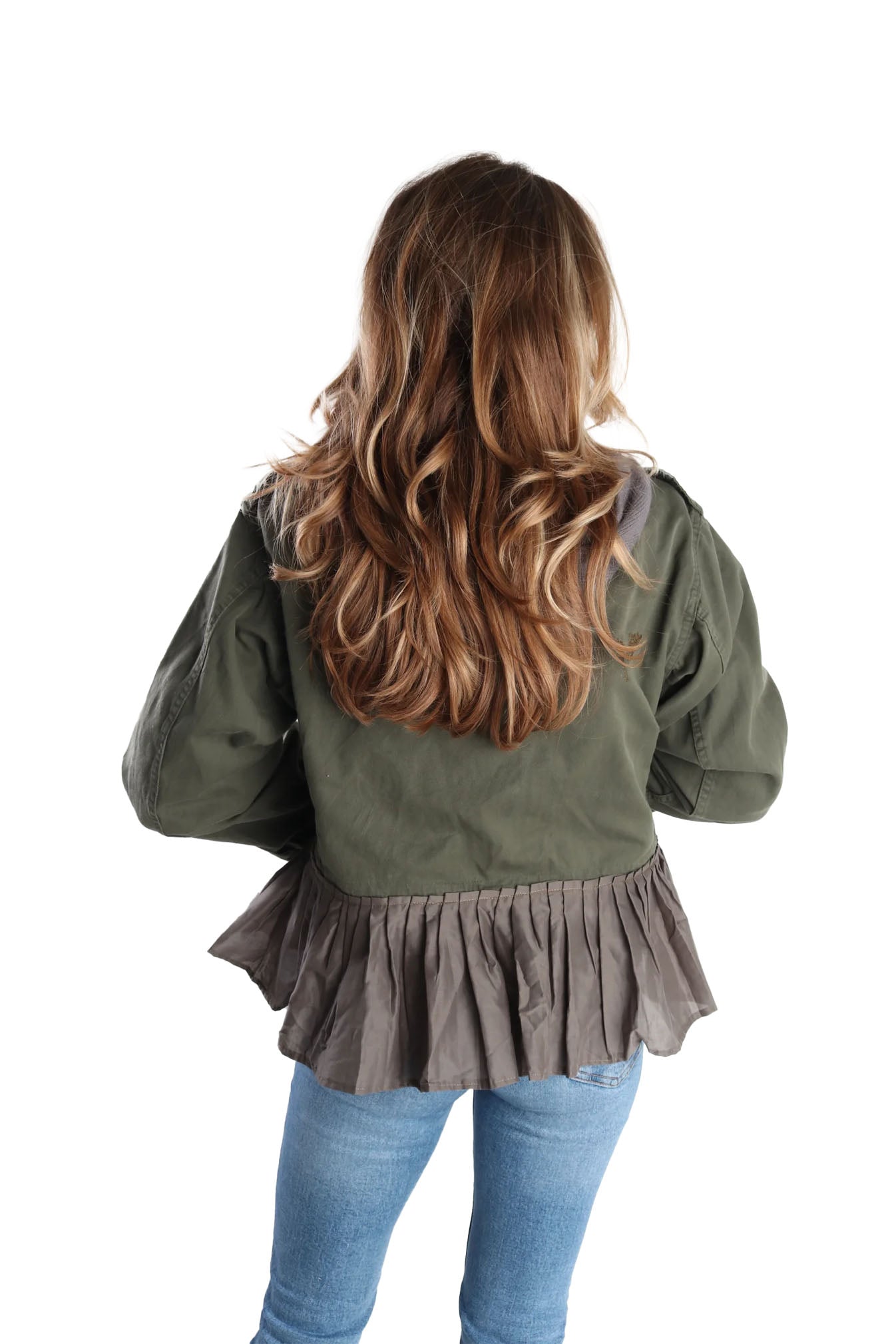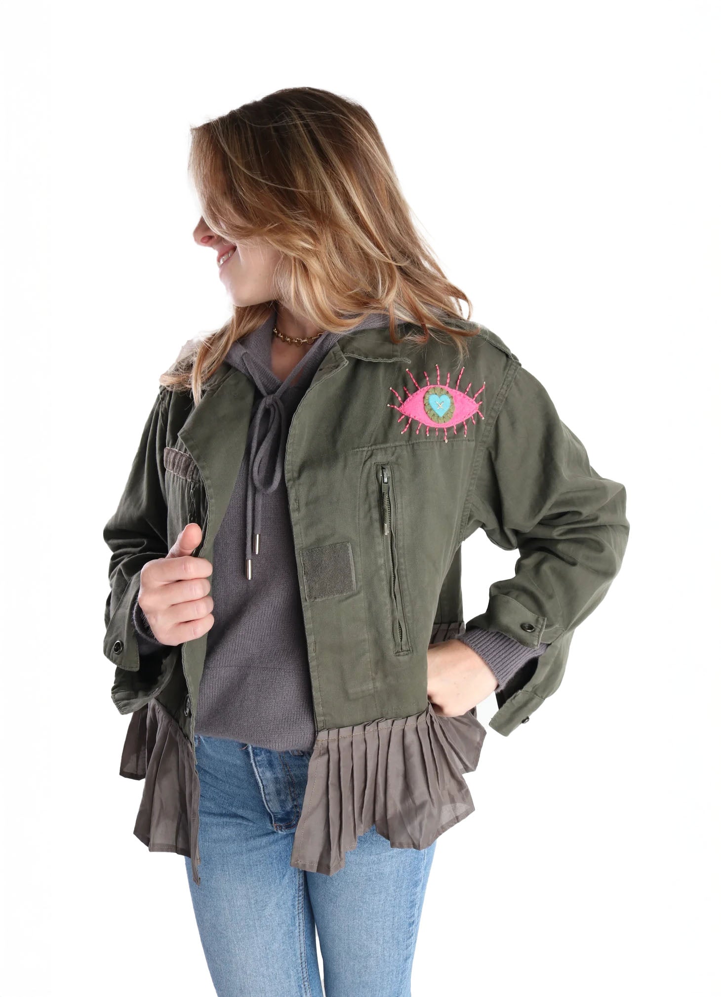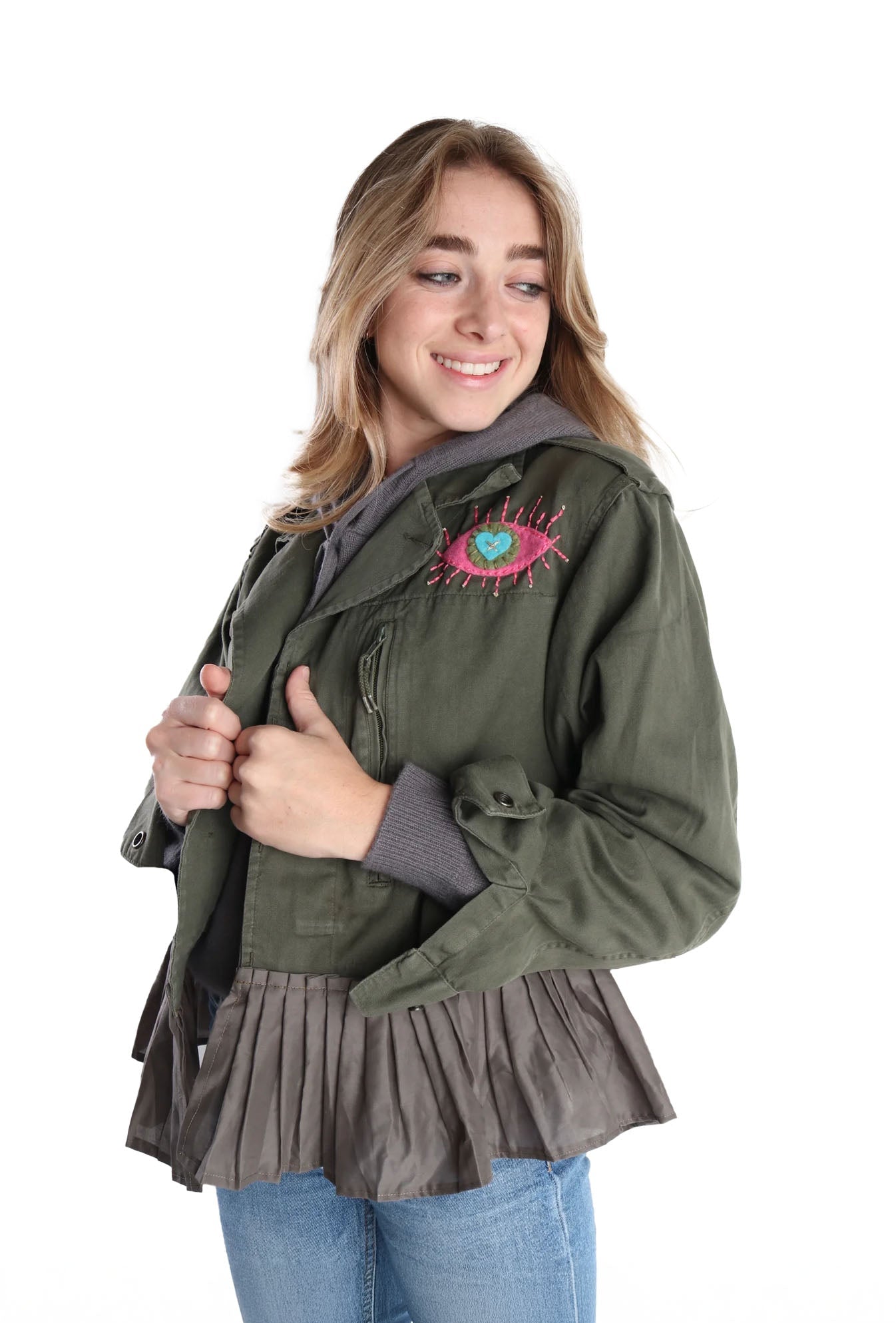 Vintage army jacket with hand-stitched evil eye embroidery. One size fits S-L