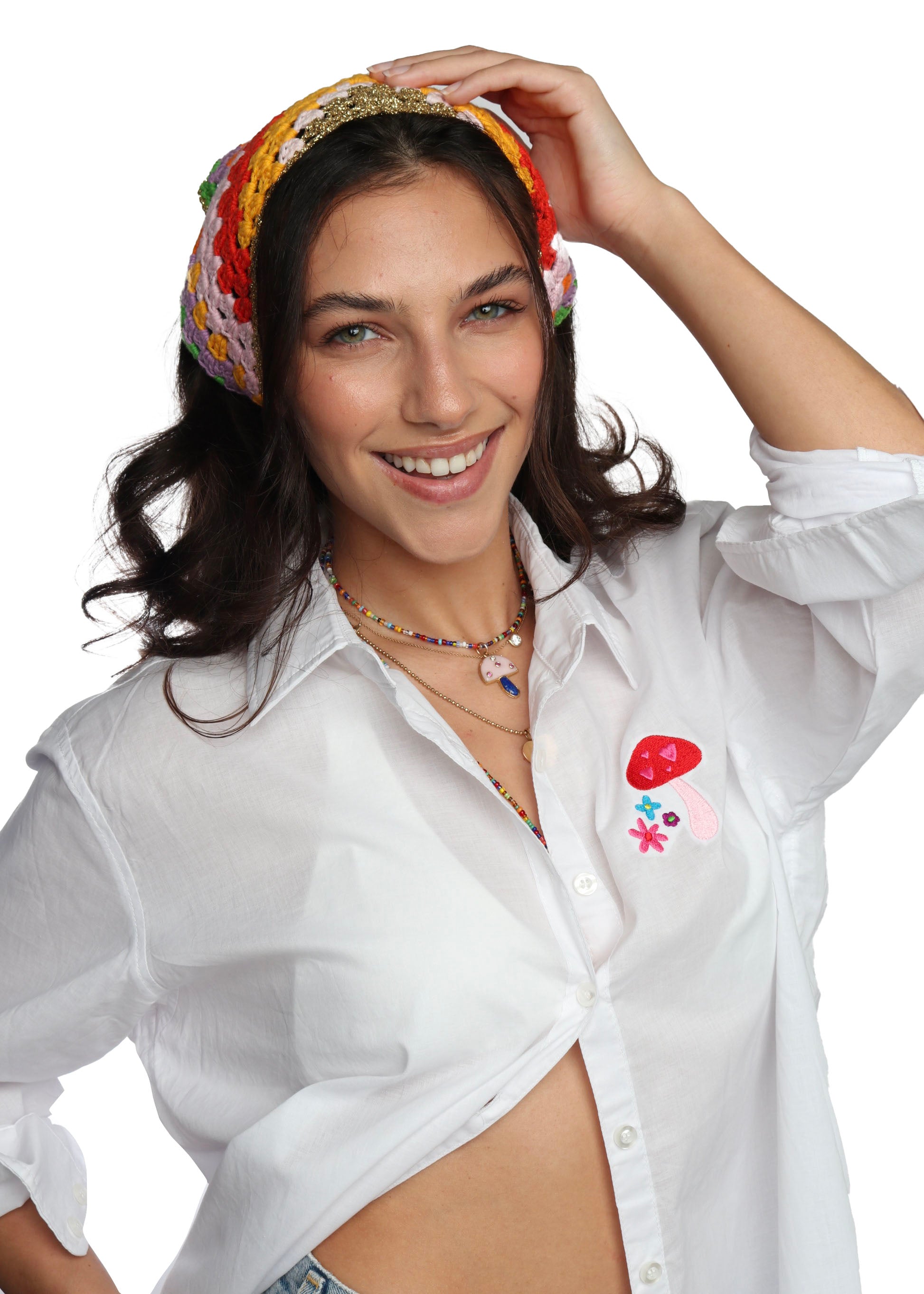 100% Lightweight Cotton button-down shirt with good vibes chest embroidery. One Size fits S-L. Hand wash / dry clean only.