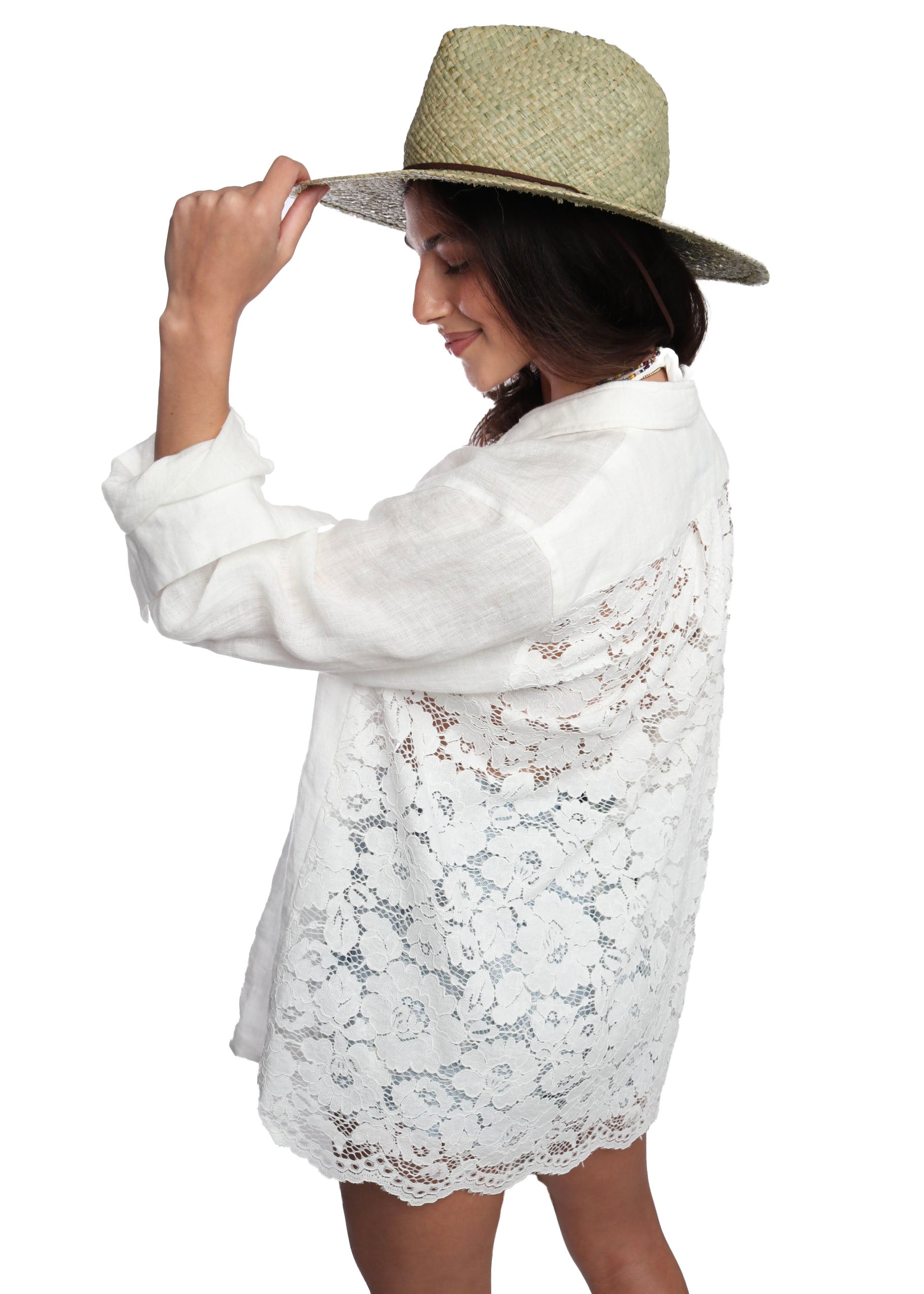 Oversized Lightweight White button-down shirt with back lace panel and grosgrain button detail. 100% Linen