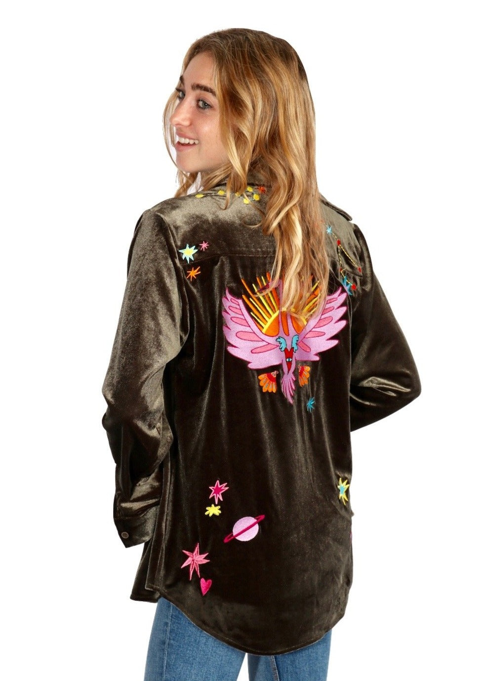 Our yummy olive velvet shirt with colorful embroidery. Dry clean only.