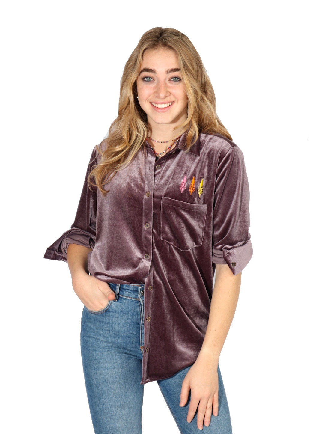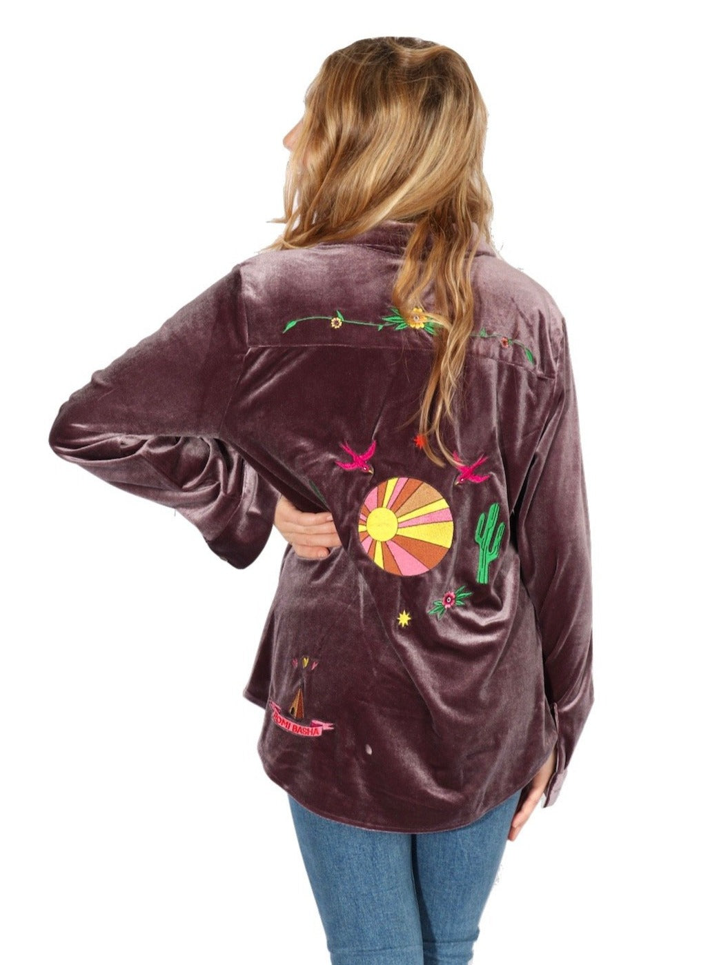 Our yummy, mauve velvet shirt with colorful western embroidery. Dry clean only.